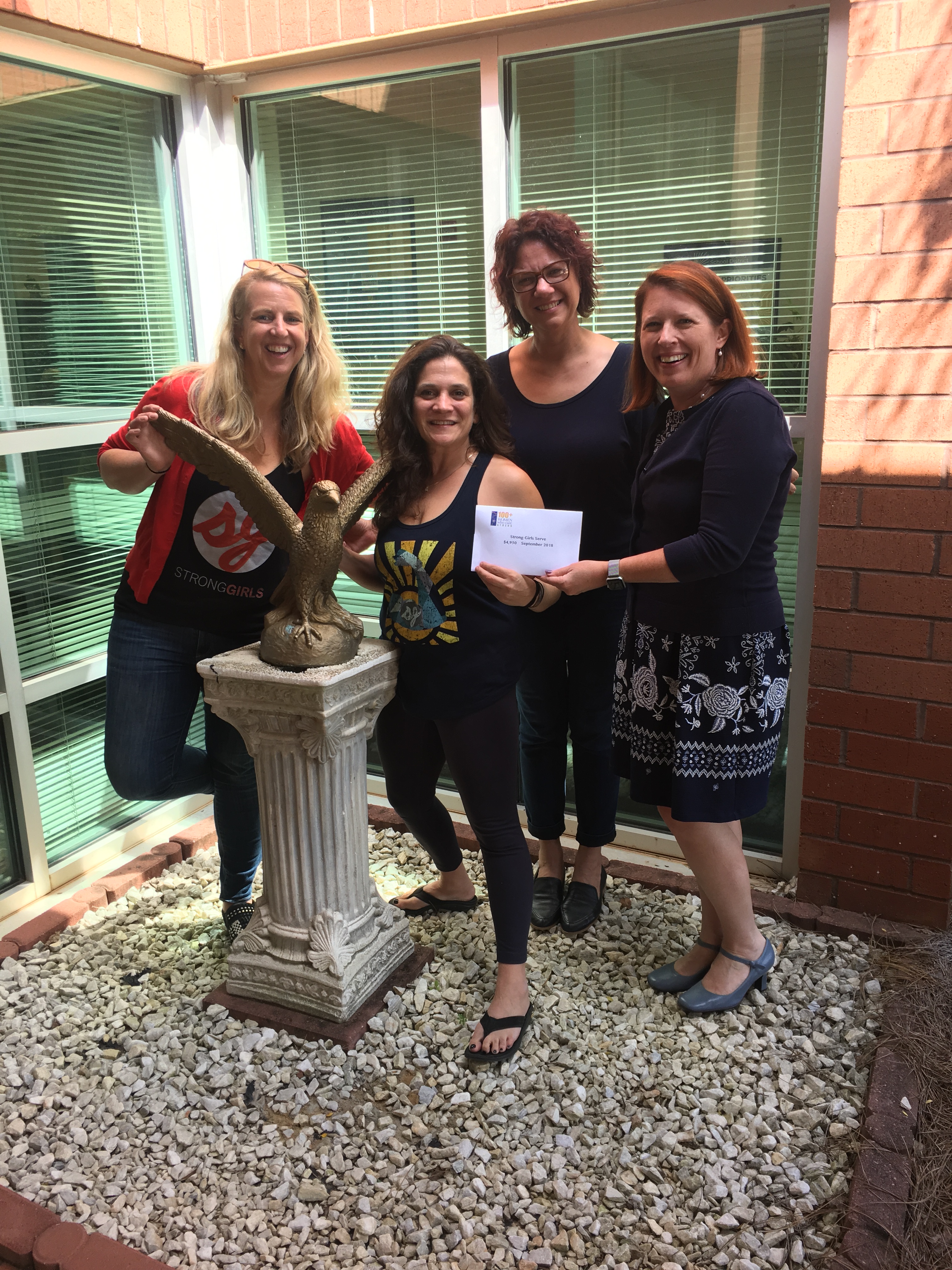 In September, we chose Strong Girls Serve, and for the first time, we hit the $5,000 mark! This organization is “all about empowering girls from elementary school to high school through community service, team-building, and leadership activities.” Strong Girls Serve was nominated by 100+ Women Who Care Athens member Kim Klonowski who joined me to deliver checks to Strong Girls Serve co-founders, Rachel and Kim. Thanks also to Strong Girls Serve intern, Natalie, for taking our photo with the Gaines Elementary Eagle!