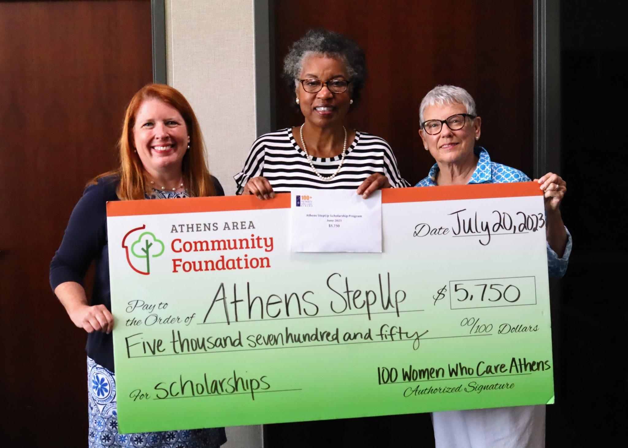 This quarter, 100+ Women Members Hattie Whitehead and Jane Nute accepted the Athens Area Community Foundation “big check” with our donations of $5,750 for Athens StepUp Scholarship Program! This great local non-profit, which Hattie founded, provides scholarships for students in need who are headed to college. We are proud to fund this organization for a second time. Thanks for all you do in our community, Hattie and Jane!
